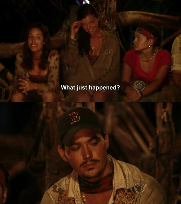 Така се получава когато се целиш в Ръсел, а не в другите хора от съюза му. Съвсем спокойно можеше 6-мата да гласуват за Даниел и след това дните на Ръсел и Парвати са преброени, но явно са глупави колкото Галу от миналия сезон. Както пише Джеф в блога си, много тъпо решение на Тайсън, за какво му беше да гласува за Парвати като ако беше гласувал за Ръсел щеше да е 3-3-3 и при прегласуването си заминаваше един от Ръсел/Парвати и вълкът цял и агнето сито ама като е толкова глупав си заслужи изгонването. Иначе най-накрая Героите изгониха Джеймс, за което се радвам, защото Колби ми е любимец и е най-големият герой от племето си. Състоянието на Джеймс щеше да се влоши и нямаше да им е полезен по-нататък и това решение бе взето за отбора, макар че изненадващо лошо се представи Колби в състезанието като дори Джеймс го победи, но явно не е толкова атлетичен както бе в Австралия и биеше наред.